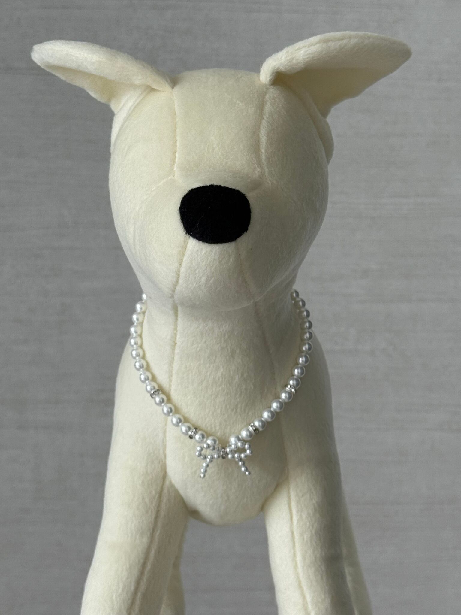 上品なホワイトパールの犬用チョーカー。中央のリボンが小型犬や超小型犬の首元をエレガントに彩ります。